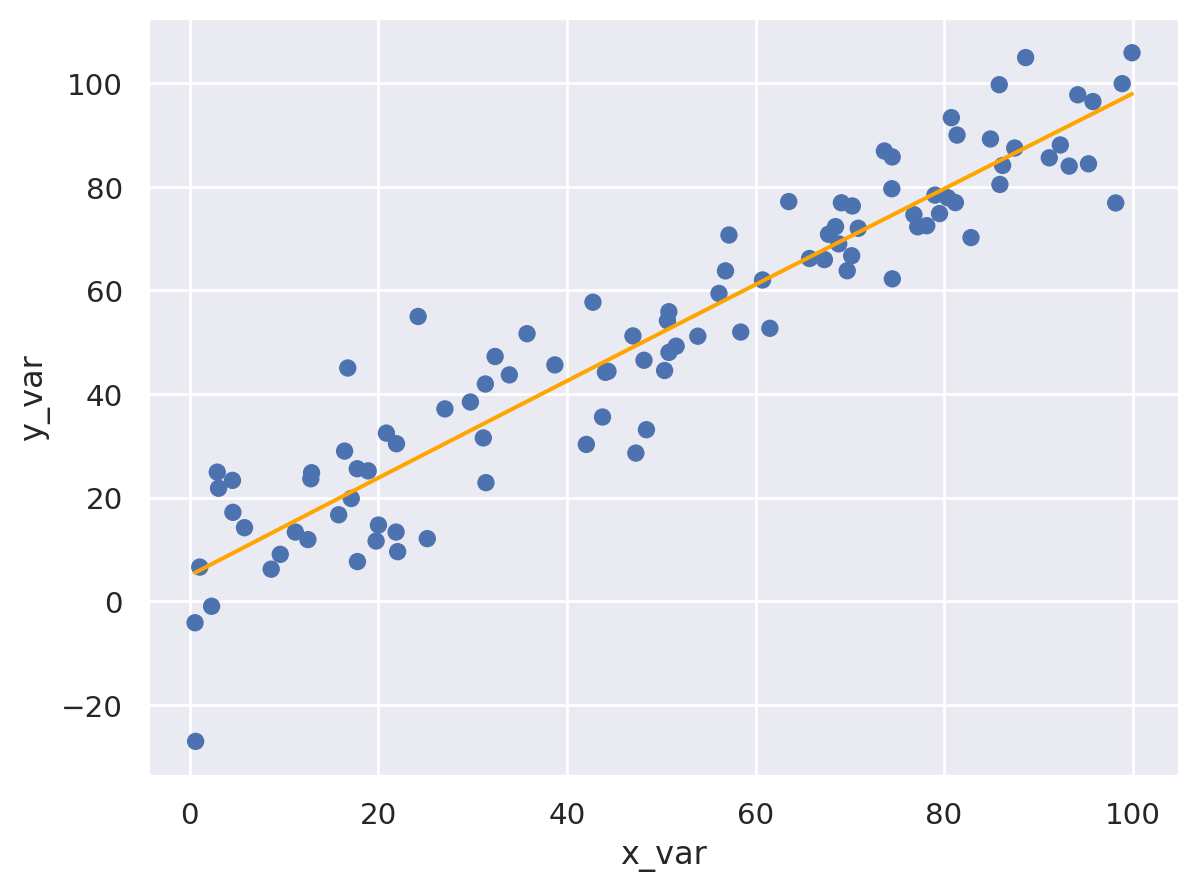 The power and versatility of the Seaborn Objects are apparent when we move from simple single layer chart to more complext multilayer charts as illustrayted in the next example. In this example, we generate and artificial regression data that link \(y_i\) as a function of \(x_i\). Using the data, we create an so.Plot() which contains both a scatter plot and a fitted linear regression. To create the scatter plot, we use the so.Dot() mark and to create the linear regression fitted line we use the so.Line() with two additional parameters: color = 'orange' and so.PolyFit() as the estimation method to fit the regression line.