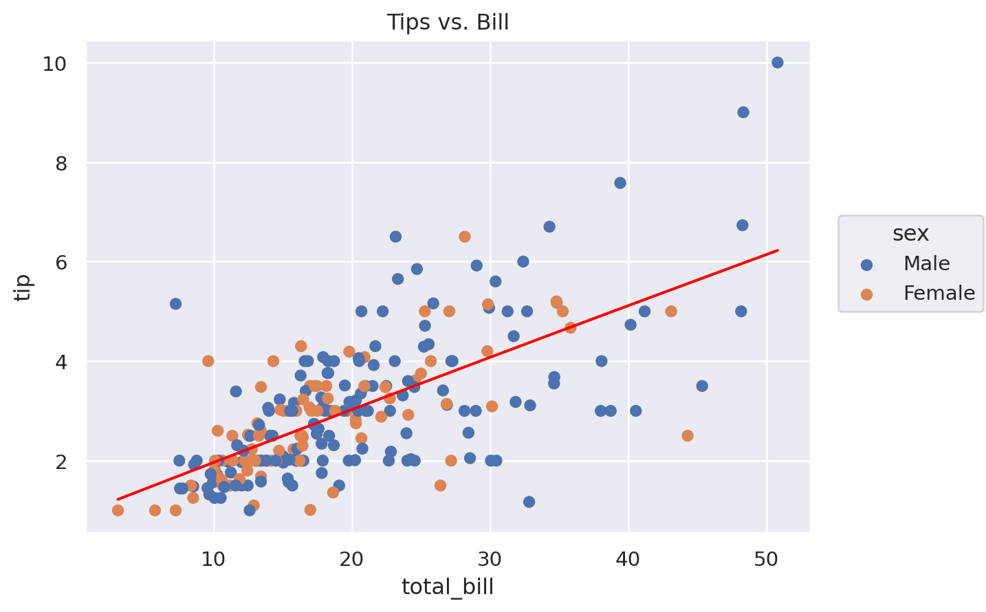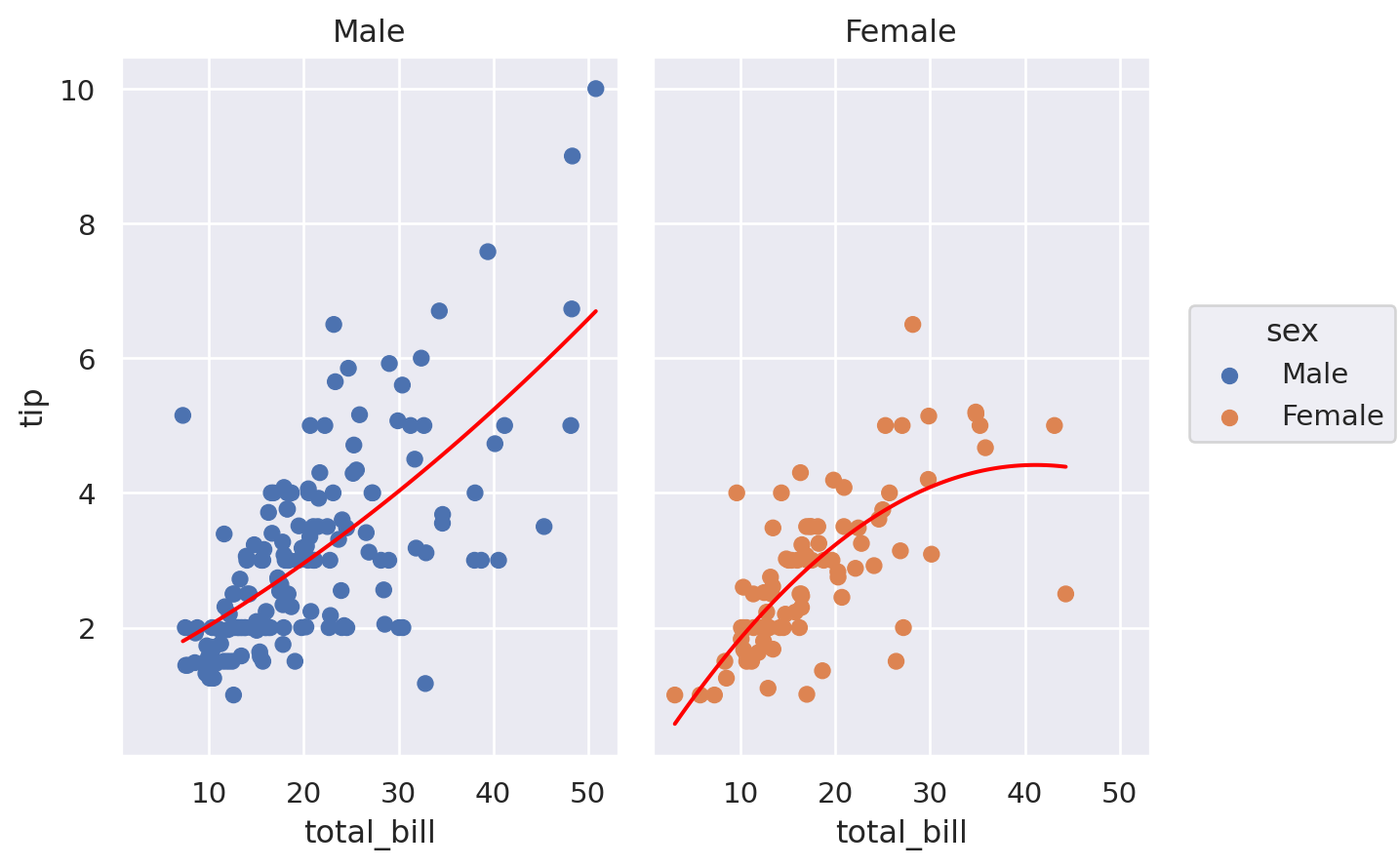 In the example below, we produce a similar multilayer plot containing a scatter plot and fitted regression line, except this time we add colour based on the variable ‘sex’ to distinguish the scatter marks for Male and Female and we add title to plot using the .label() method. Furtheremore, in the example we explicitly assign a name (‘fig’) to the so.Plot() seaborn object we created and we illustrate how the ‘fig’ object is nothing but a Matplotlib figure object and thus we can specify the .show() or the .save() methods to show and save the plot.